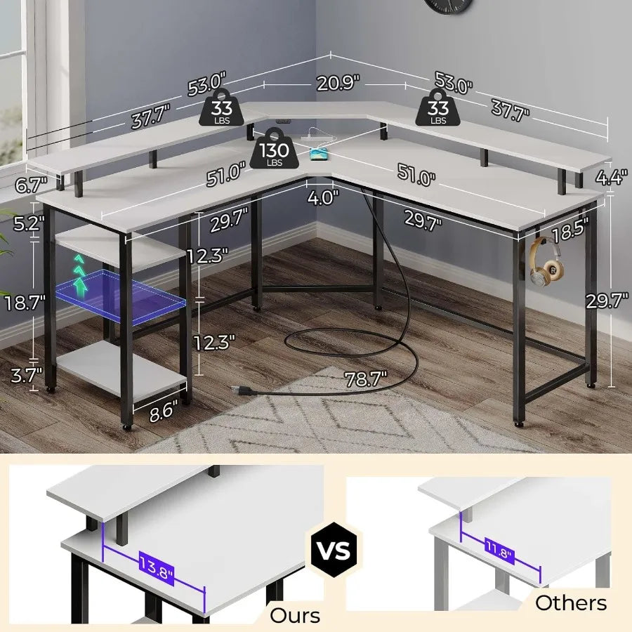 Cool RGB Led Light Strips Kit - The L shaped desk is equipped with LED light strips, which can provide 20 colors and 5 dynamic modes.When entertaining, dim the lights and choose your favorite colors to fully immerse yourself in the game. When working, match your favorite color to make you work more focused.It features memory function which keep the led strip lights staying on last mode when turned on. The smart led lights strips are in multiple control modes via 44 keys remote and controller box.