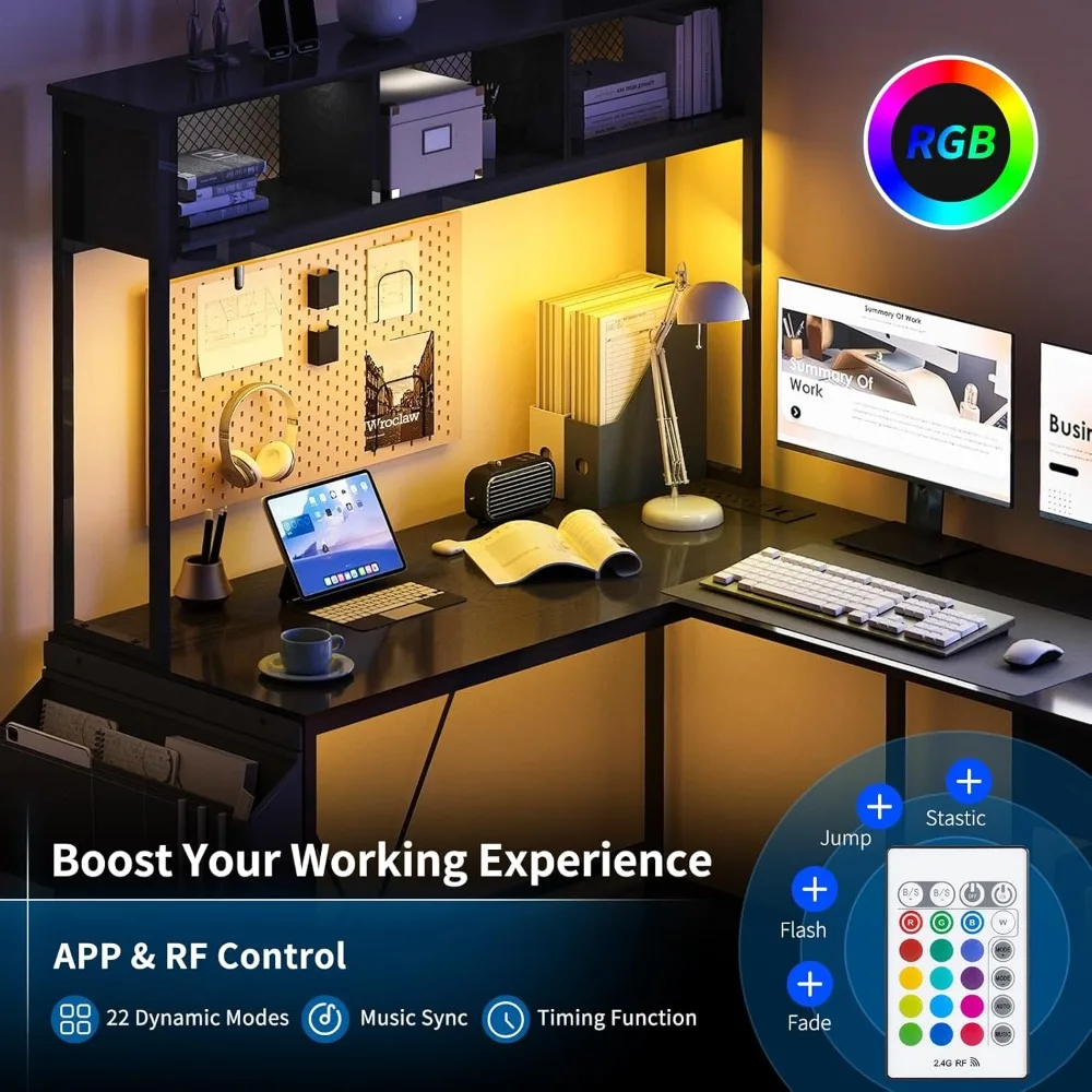 - Gaming Table with Smart LED Light: Our L-shaped gaming desk with RGB LED lights creates more fun for gaming enthusiasts, which features over 60000 colors and 29 flashing modes via APP or remote control. Built-in music sync function can change the light color with the rhythm of sound and music, make your life chill. And with timer function, the LED lights will stay in the last mode when turned on. Choose your favorite color and mode, let the game begin!